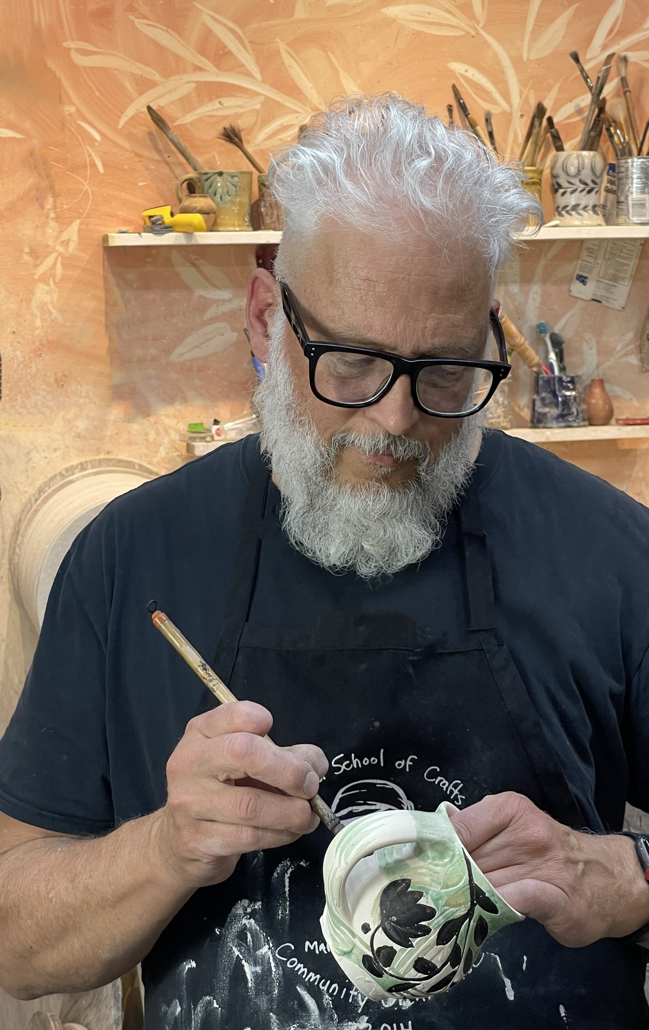 Michael Kline makes utilitarian ceramics with botanical-themed painted and stamped surfaces. For most of his career, Kline has worked with wood-fired salt-glazed stoneware, usually with organic patterns painted on a thick white slip surface. In 2015 he visited the Freer-Sackler Wing of the Smithsonian and was struck by 15th C. examples of the Korean sanggam technique. Since then, he has focused on applying this technique to his own work and aesthetic, creating floral stamps and inlaying the impressions with white slip on a dark stoneware base. Kline’s work is consistently identifiable in its delicate pattern systems contrasted with robust forms and somewhat coarse materials. Michael’s work is in the collection of the Islip Art Museum in NY, San Angelo Museum of Fine Arts in San Angelo, TX, and The Gregg Museum in Raleigh, NC.