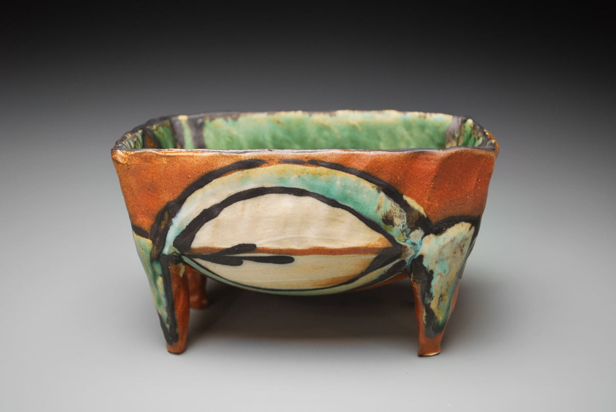 When I make pots, I subtly suggest figure and character by manipulating forms after they are thrown. I roll out clay slabs and use them to hand build elements that are then assembled with thrown parts to create pieces that have a personality of their own. I like to experiment and play with form and proportion on functional ware by altering and stacking parts. When I decorate the surfaces with slips and glazes, I am very interested in making the marks and designs enhance the volume of each pot. I am inspired when I see historical pots from many cultures, including Japan, Crete, Chile, China, and native North American. The pots I respond to may be a quirky Pre-Columbian animal ewer, or the sophisticated designs of a Mimbres bowl.