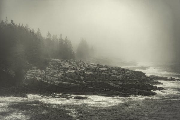 Moody capture of a rocky coastline on a foggy morning in Acadia National Park