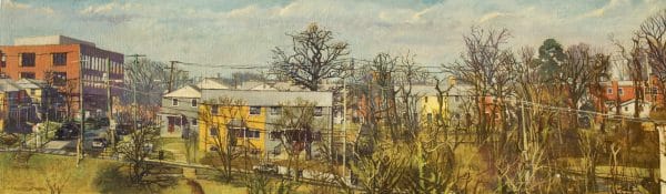 This oil painting exhibits the new facility(Ferebee/Hope Recreation Center) after months of construction. This building is displayed on the far left of the painting towering over the row houses. This work exhibits the every changing presents of our city.