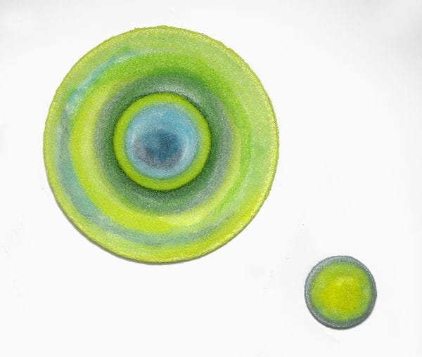 In this work, my impression of the sun reflected on water from real life observation one summer late afternoon, was expressed in an abstract way. In the large 3D orb like circle, the blurred concentric circles symbolize the sun reflected on calmly rippled water and the small circle represents water drop reminding us of precious elements(sun, water) to sustain our being.